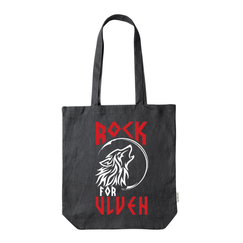 Handlenett i 100 % resirkulert bomull (140 gsm) med forsterkede bærehanker. Melert gråfarget og trykket med stor Rock for Ulven logo